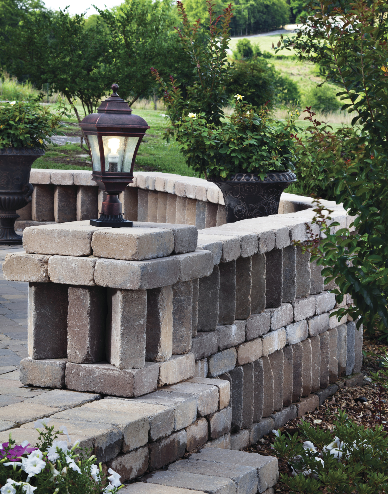 Using a column for an endcap adds a finished look to a retaining wall, landscape wall or seat wall. Finishing touches can include a light fixture, low voltage hardscape lighting, or a built-in planter.